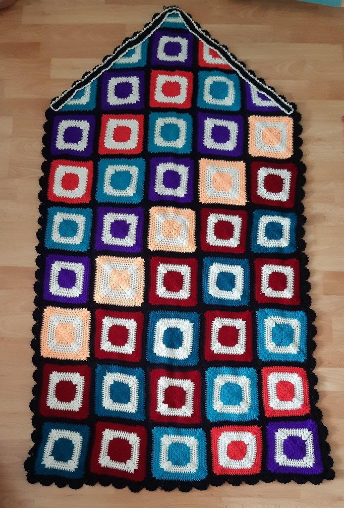 Koyu renkli, çok renkli kareli el örgüsü seccade, çeşitli canlı renklerde karelerden oluşan rahatlatıcı bir tasarıma sahiptir.
