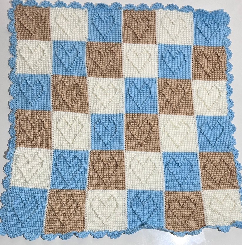 Çocuklar için örgü kumaştan, açık mavi, kahverengi ve krem renklerinde kareli desenli, kalp motifli yumuşak battaniye.
