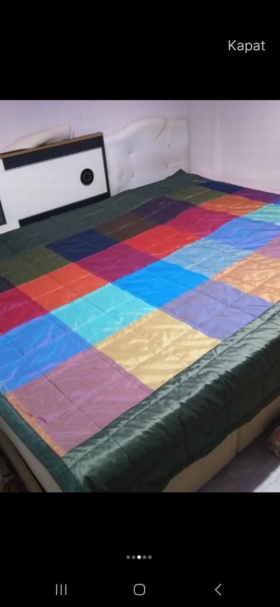 Çok renkli, koyu tonlarda kareli desenli yatak örtüsü, yatak odasına canlılık katıyor. ️çift kişilik yatak örtüsü