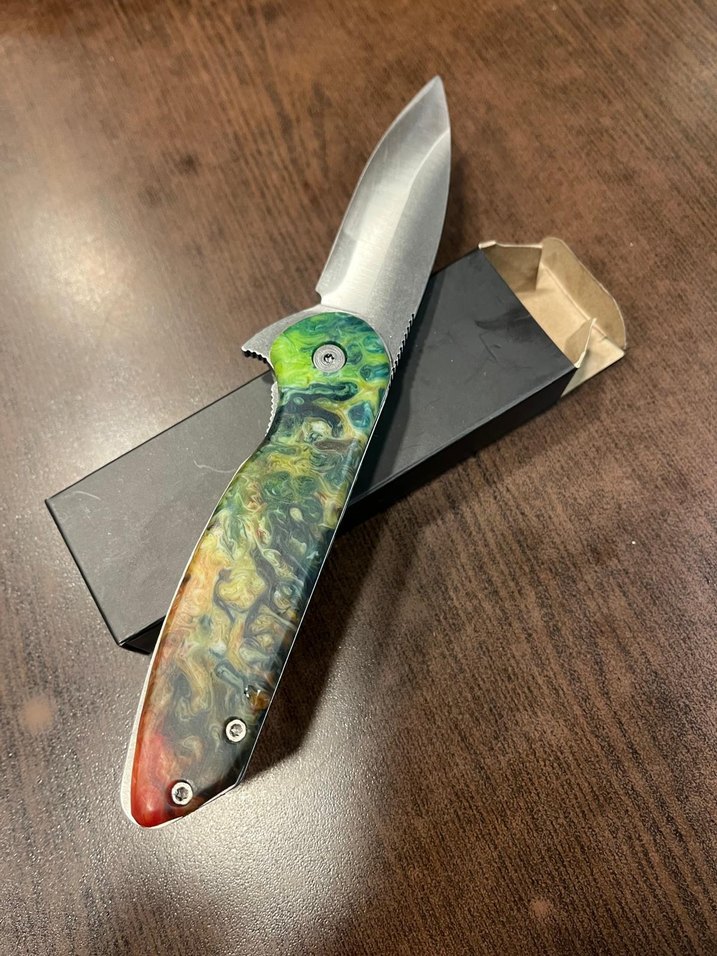 Parlak çok renkli, koyu tonlarda sapı ve keskin paslanmaz çelik bıçağı olan katlanabilir cep bıçağı. Siyah kutu ile birlikte.
