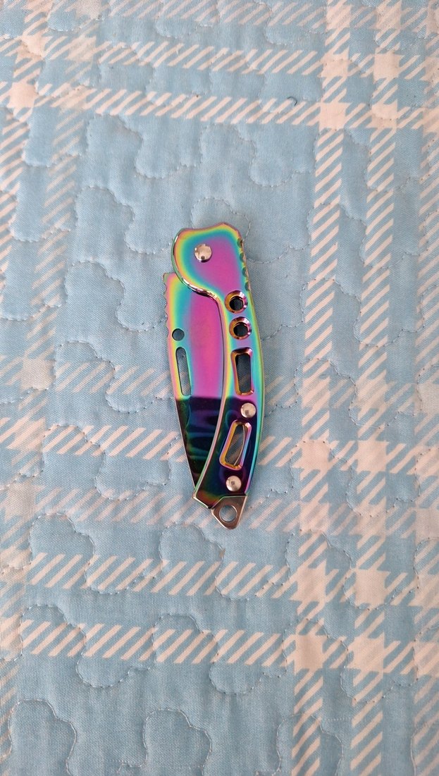 Çok renkli metalik görünüme sahip, katlanabilir ve kilit mekanizmalı kompakt cep bıçağı.