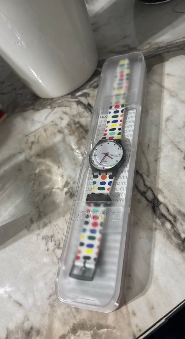Çok renkli puantiyeli kayış ve tokalı kapanışa sahip, gri yuvarlak kadranlı kadın saati. Sokak tarzı ve avangart görünüme uygundur. ⌚