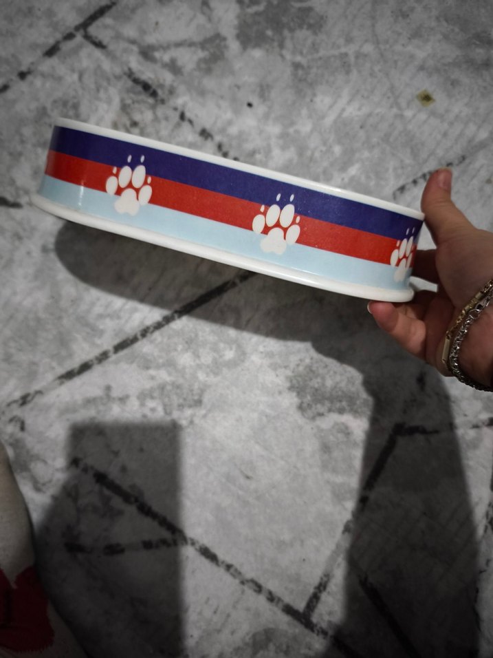 Köpekler için çok renkli, çizgili ve pati desenli mama kabı.