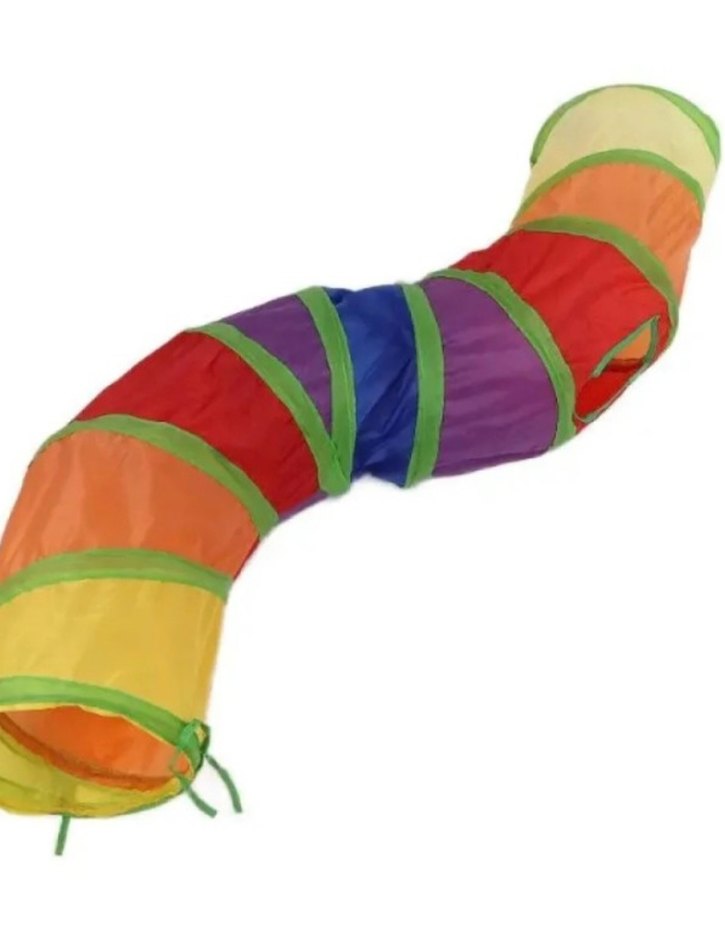 Çok renkli, kedi için oyun tüneli. Canlı renklerle bölümlere ayrılmış, sürünerek oyun oynamaya uygundur.