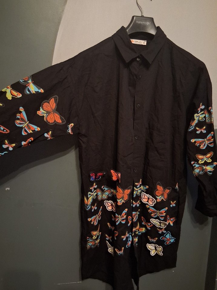 Düğmeli, yakalı ve uzun kollu bu bol kesim gömlek, çok renkli kelebek desenleriyle bohem sokak tarzını yansıtıyor.