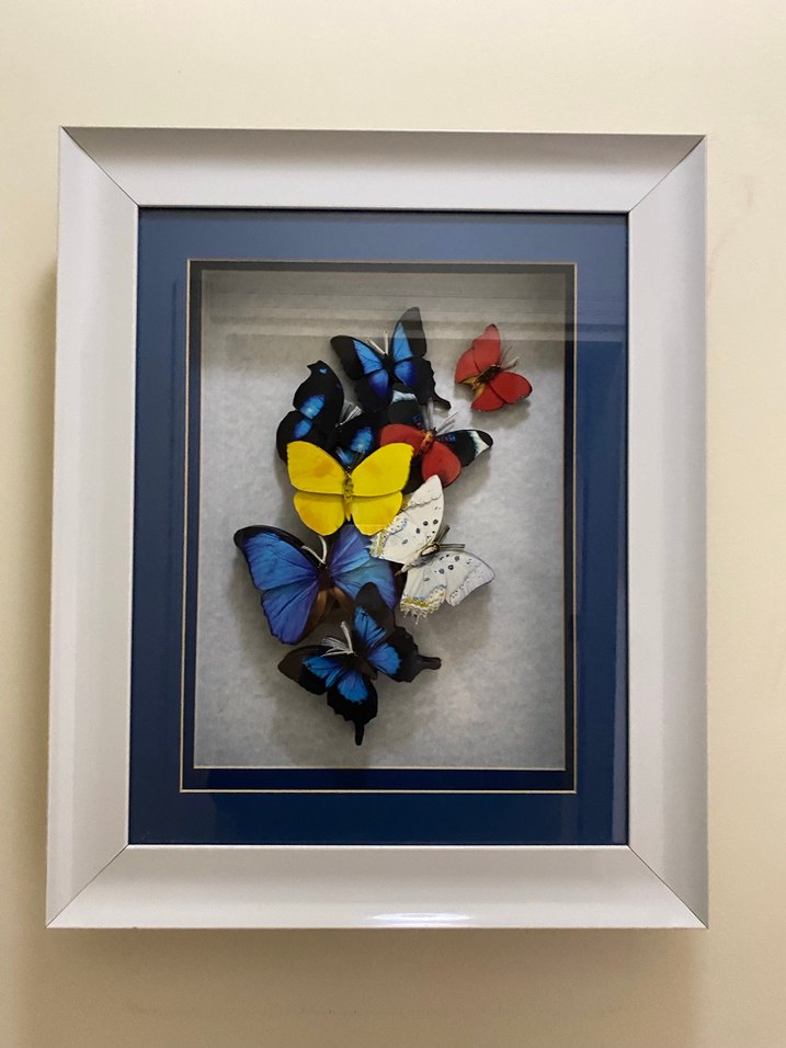 Koyu mavi arka plan ve şık beyaz çerçeveli çok renkli kelebek temalı tablo