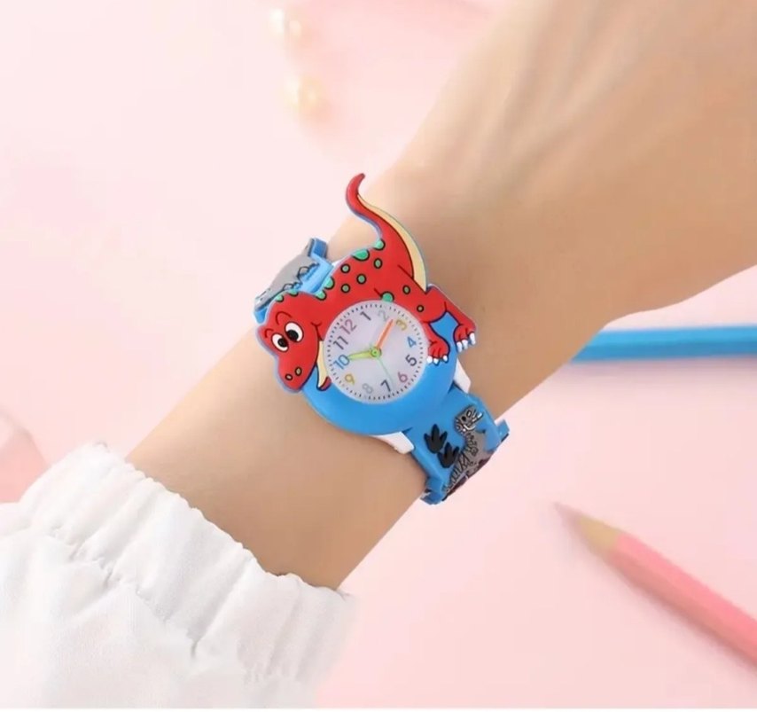 Çok renkli, kemerli plastik kayışlı, dinozor figürlü ve yılan desenli erkek çocuk saati.