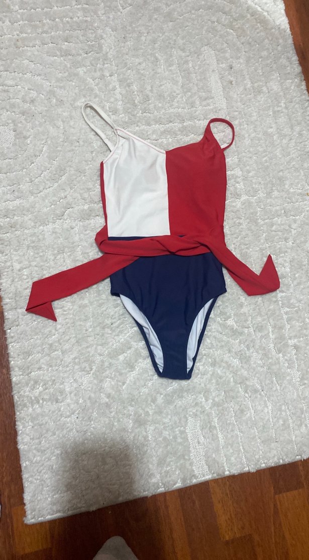Orjinal POLO MARKA İnce askılı, kemerli, kısa kesim çok renkli kadın mayo. Fit kesimi ve renk bloklarıyla plajda şık görünüm sağlar.