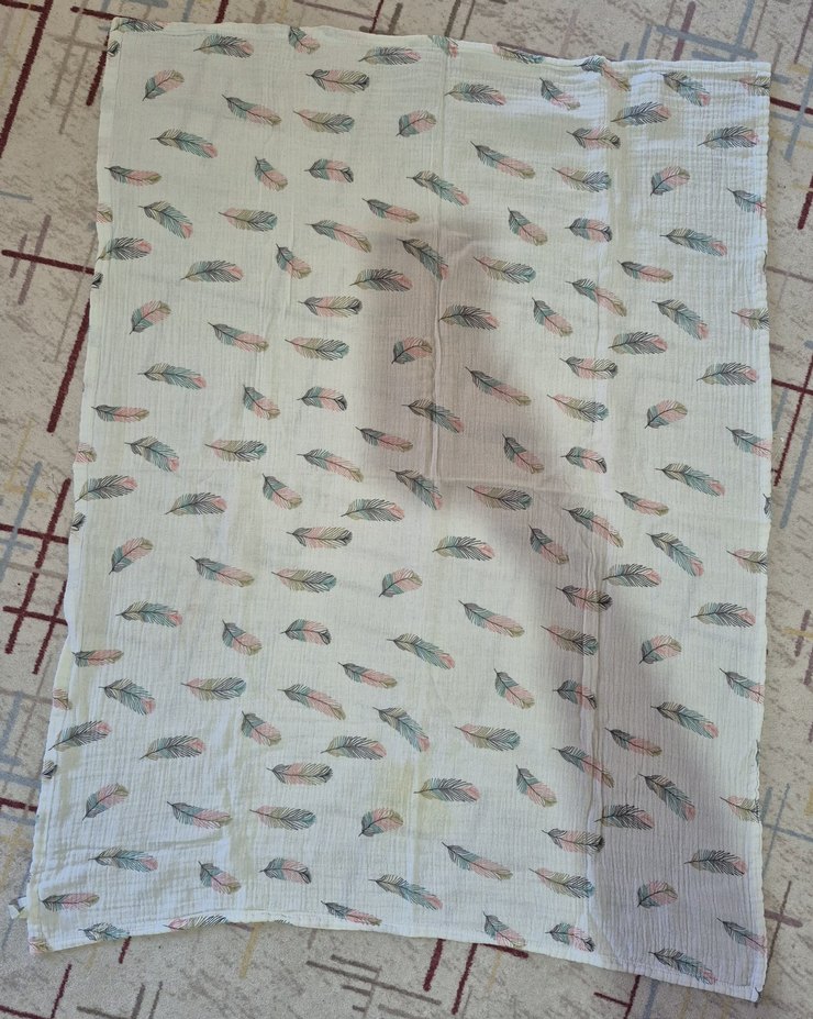 Çok renkli tüy desenli, yumuşak keten kumaştan yapılmış açık renkli çocuk battaniyesi. Çocukları sıcak tutar. ️