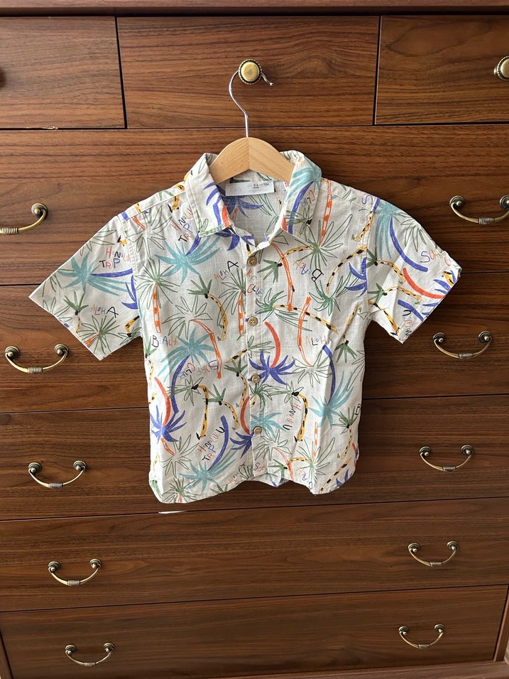 Erkek çocuklar için kısa kollu, düğmeli ve yakalı gömlek. Pamuklu, çok renkli ve hafif batik desenlidir, rahat sokak stili için uygundur.