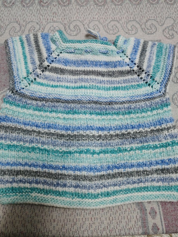 Kısa boy, kayık yaka ve kolsuz çok renkli bebek yelek Yumuşak örgü kumaştan, rahat kesimlidir. Gri, mavi ve yeşil tonlarında çizgili, günlük kullanıma uygun.