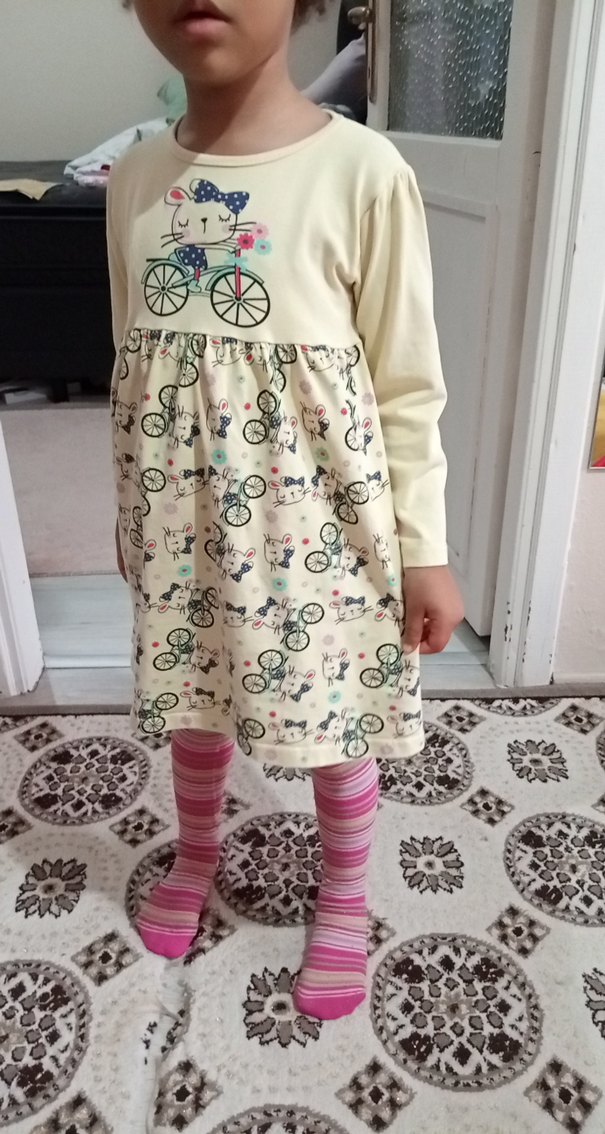 Yumuşak ve sıcak kumaştan, uzun kollu, bisiklet ve kedi baskılı, elastik bel detaylı bol kesim kız çocuk elbisesi.