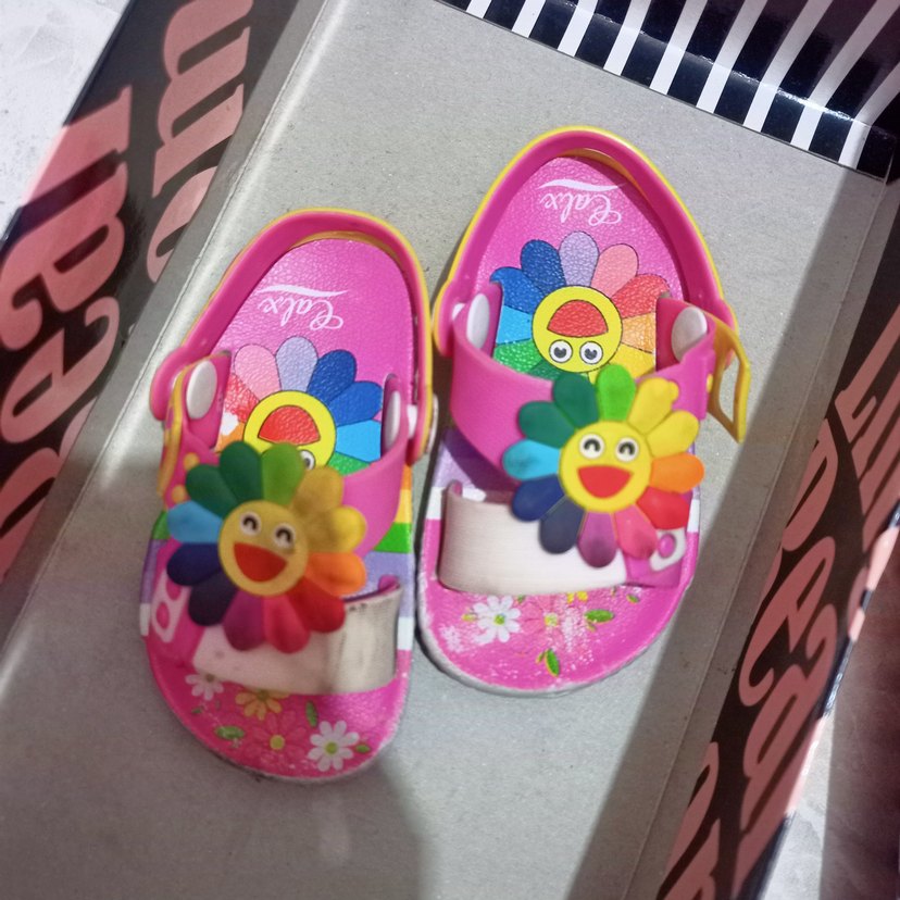 Çok renkli, çiçek desenli kız çocuk terliği. Neşeli çiçek süslemeli, lastik malzemeden ve cırt cırtlı bantlıdır. pembe sandalet