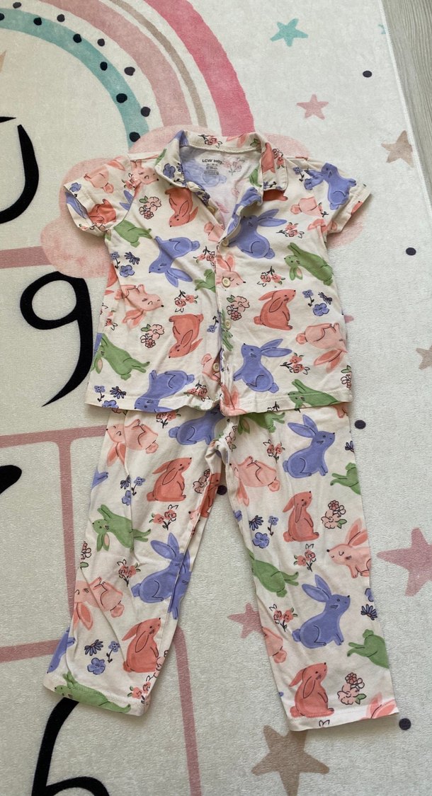 Kısa kollu, düğmeli ve yakalı kız çocuk pijama takımı. Pamuklu, çok renkli bağlama desenli ve sevimli tavşan baskılı.