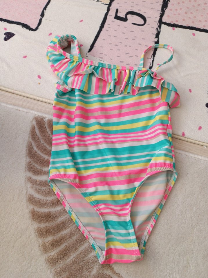Çok renkli, askılı ve fırfırlı yaka detaylı kız çocuk mayosu, canlı çizgili desene sahiptir. bir kez giyildi herhangi bir sıkıntısı yok