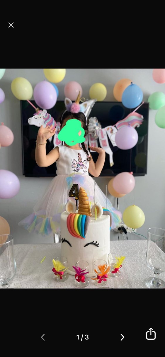 Çok renkli, straplez kız çocuk elbisesi, baskılı unicorn deseni ve yumuşak, renkli kumaştan fırfırlı katmanlara sahiptir. Moda ve pop kültür tarzında. 3.4 ufak tefekse kızınız beş yaşada olur
