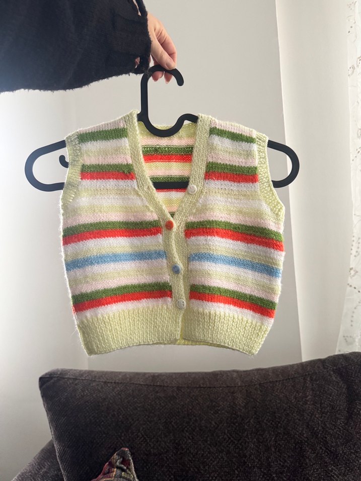 Çok renkli çizgili, V yaka ve kolsuz, triko dokulu kız çocuk yeleği. Sıkı kesimiyle modern ve dikkat çekici bir tarz sunar.