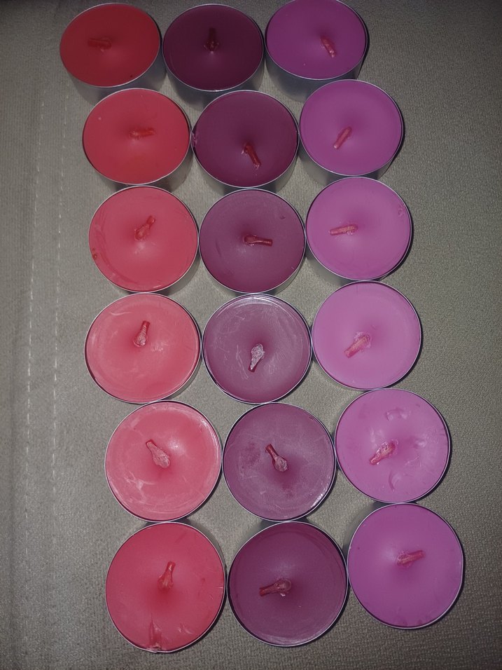 Pembe ve mor tonlarında çok renkli, hafif kokulu tealight mum seti. Sıcak bir ortam yaratmak için uygundur. ️