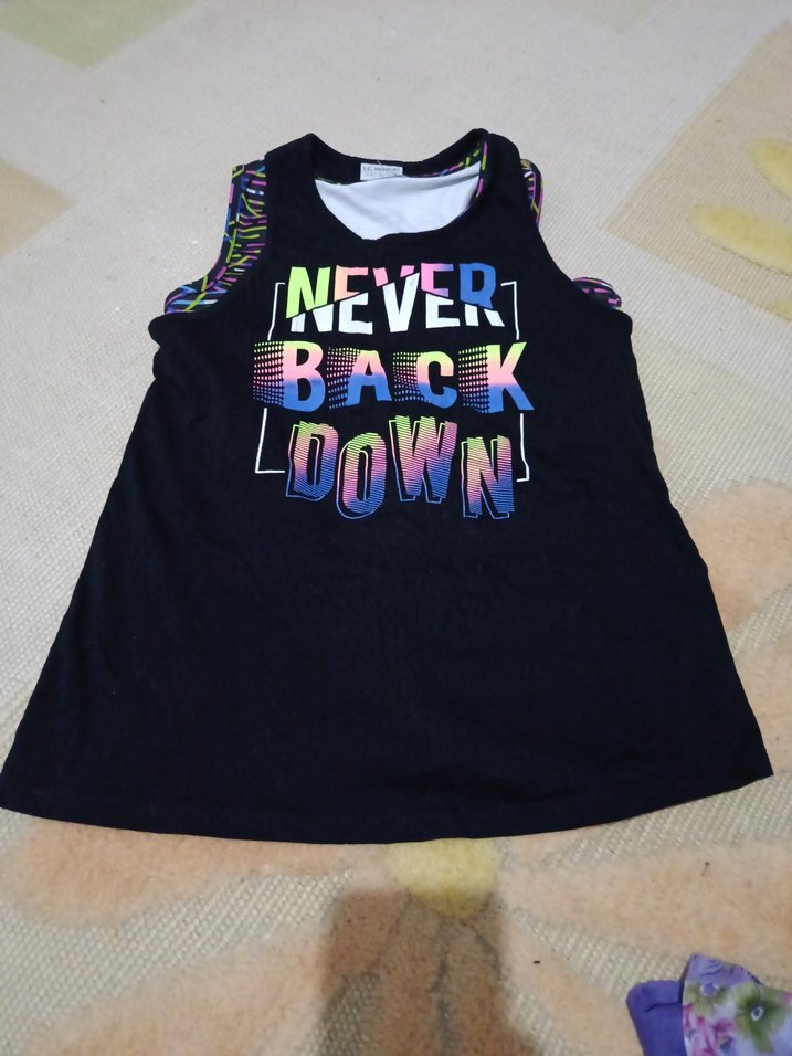 Çok renkli, kolsuz ve bol kesim kız tişörtü. "NEVER BACK DOWN" baskılı, kayışsız yakalı Rock punk tarzını yansıtır. ikili takım