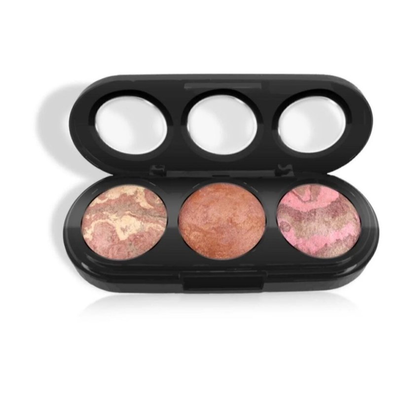 Bu allık paleti, koyu tonlarda üç çok renkli allık içerir ve siyah kompakt kutuda sunulur.