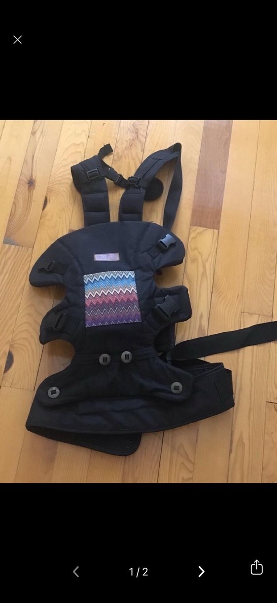 Ayarlanabilir askılı, koyu renkli ve önünde çok renkli desen bulunan bebek taşıyıcı.