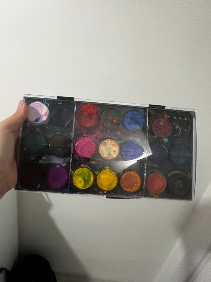 Çok renkli, koyu tonlarda suluboya boyalar içeren plastik kutuda taşınabilir boya seti. Faber ve Polisan 2 se