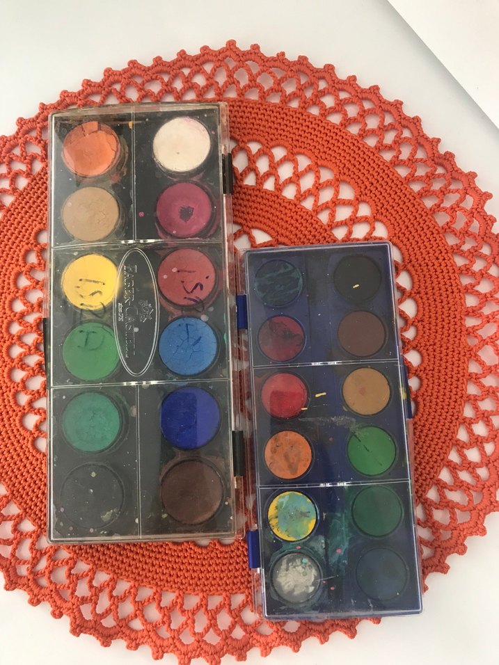 İki küçük kutuda çeşitli koyu ve canlı renklerde suluboya boyalar bulunur.