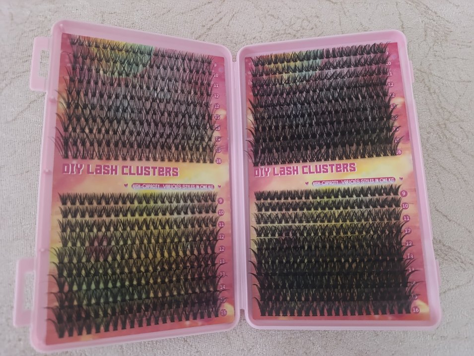 Çok renkli koyu takma kirpikler, farklı boyutlarda kümelerle hacim ayarı sağlar. Kutuda "HCLUSTERS" ve "OIY Lash Clusters" yazısı bulunur.