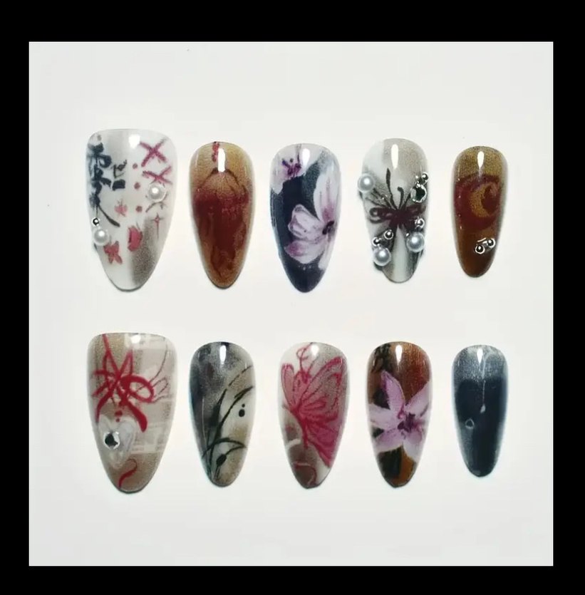 Çiçek ve soyut desenler içeren, inci detaylı çok renkli koyu tırnak süslemeleri seti. S beden