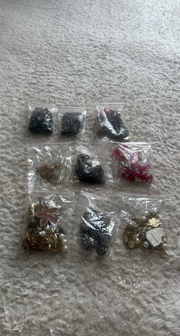 Farklı şekil ve süslemeler içeren çok renkli ve koyu tonlarda tırnak süslemeleri seti, küçük şeffaf poşetlerde sunulmuştur.
