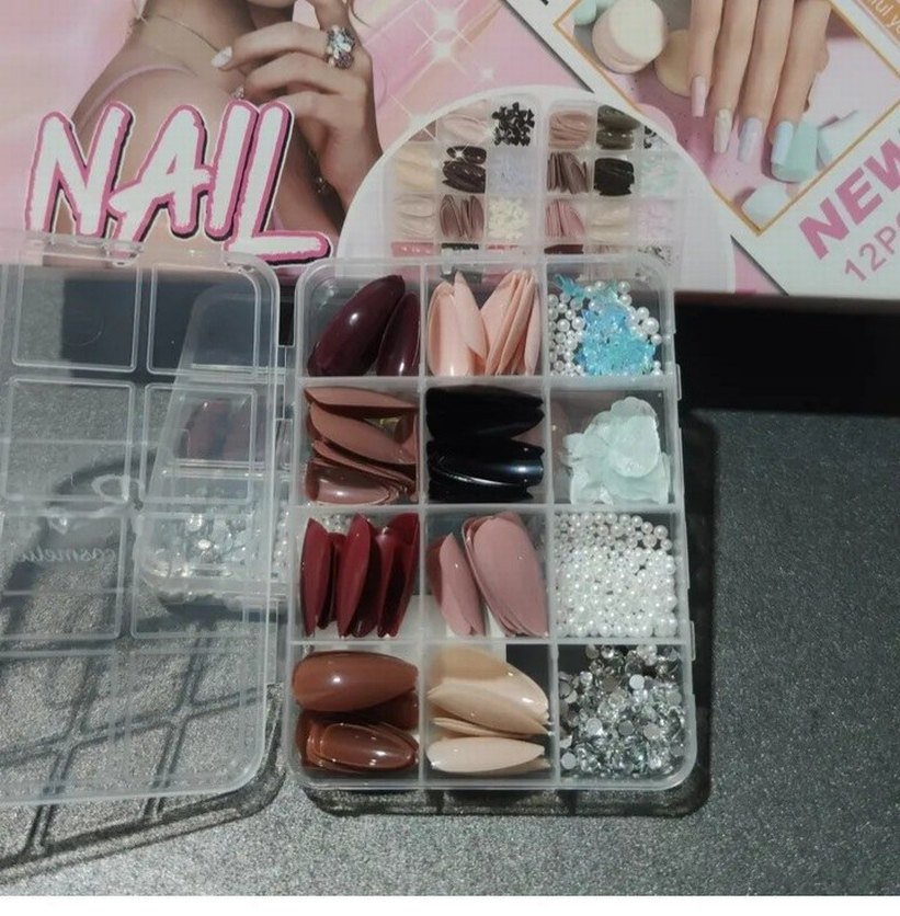 Koyu ve çok renkli tırnak süslemeleri, inci ve taş detaylarıyla şeffaf kutuda düzenlenmiş bir set.