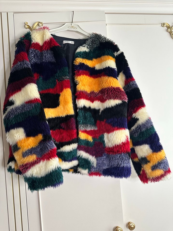 Kürk detaylı midi mont. Rahat kesim. Hiç kullanılmadı. Fermuar yok. Renkleri canlı.