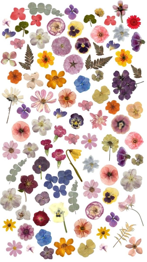 Çok renkli kurutulmuş çiçek stickeri, çeşitli açık tonlarda doğal ve zarif bir görünüm sağlar.