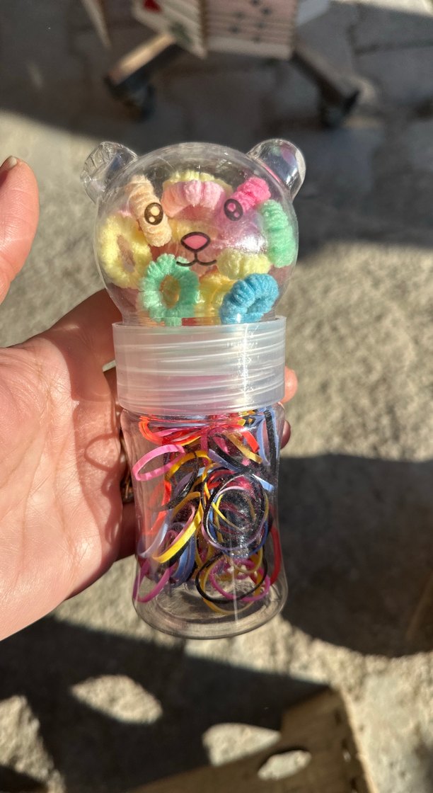 Bohem, hippie ve retro tarzlar için çok renkli, lastikli çocuk saç tokaları ayıcık şeklinde kutuda.