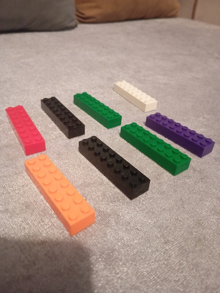 Siyah, yeşil, mor, beyaz, kırmızı ve turuncu gibi koyu canlı renklerde çeşitli Lego blokları, gri bir yüzey üzerinde yer alıyor.