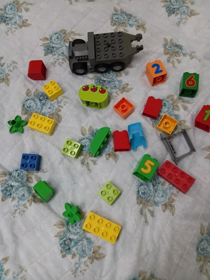 Numaralı küpler, yeşil yaprak parçaları ve gri araç tabanı içeren çok renkli Lego blokları seti. Yaratıcı yapılar için uygundur. hepsi