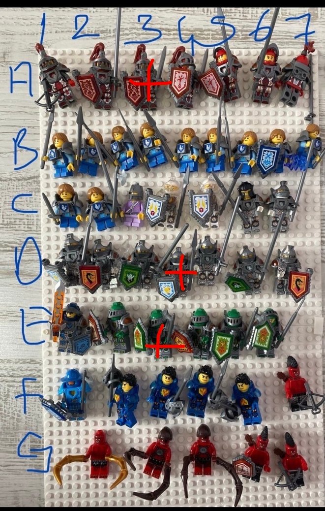 İşaretli 3 figür ve tam ekipmanlı ilanıdır. Kalkanlar ve silahlarla donatılmış çok renkli Lego Orta Çağ figürleri seti, şövalyeler, askerler ve okçuları içerir. ️