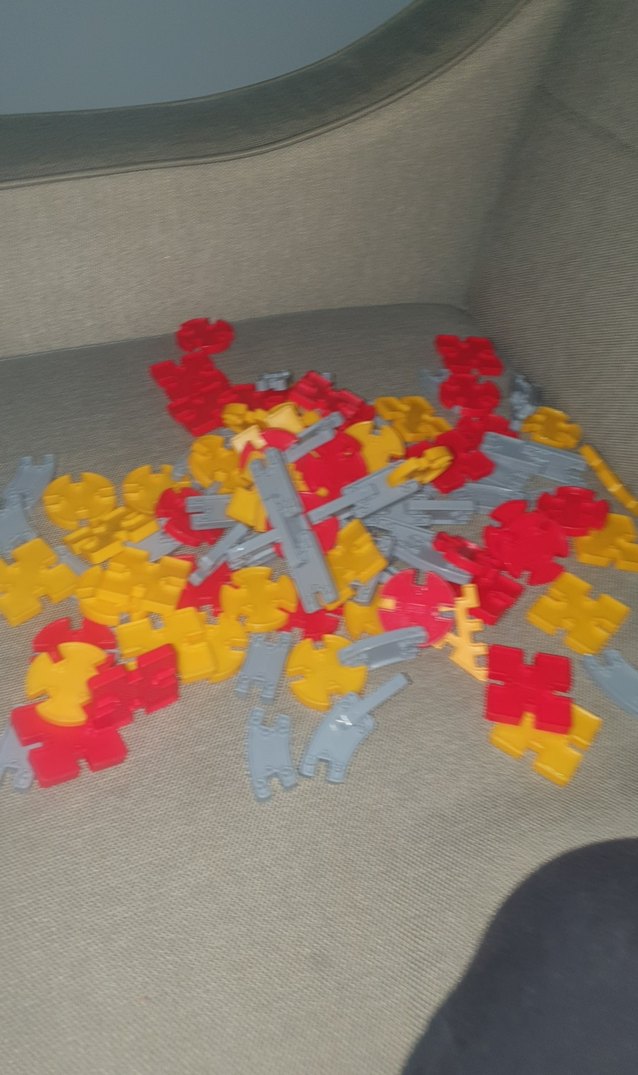 Kırmızı, sarı ve gri renklerde karışık Lego parçaları, yaratıcı yapılar için uygundur.