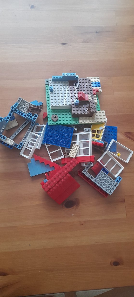 Gri, mavi, kırmızı ve yeşil renklerde pencere, merdiven ve taban plakaları içeren çok renkli Lego parçaları seti.