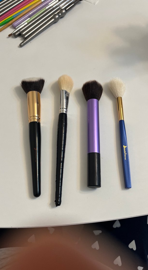 Farklı makyaj uygulamaları için çok renkli küçük fırçalar ve koyu renk saplı çeşitli makyaj fırçalarından oluşan set. ️