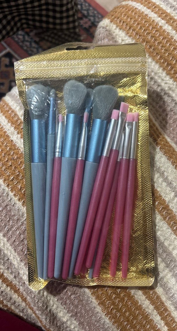 Farklı boyut ve şekillerde, koyu mavi ve pembe saplı, yumuşak kıllı makyaj fırçalarından oluşan set, altın renkli poşette.