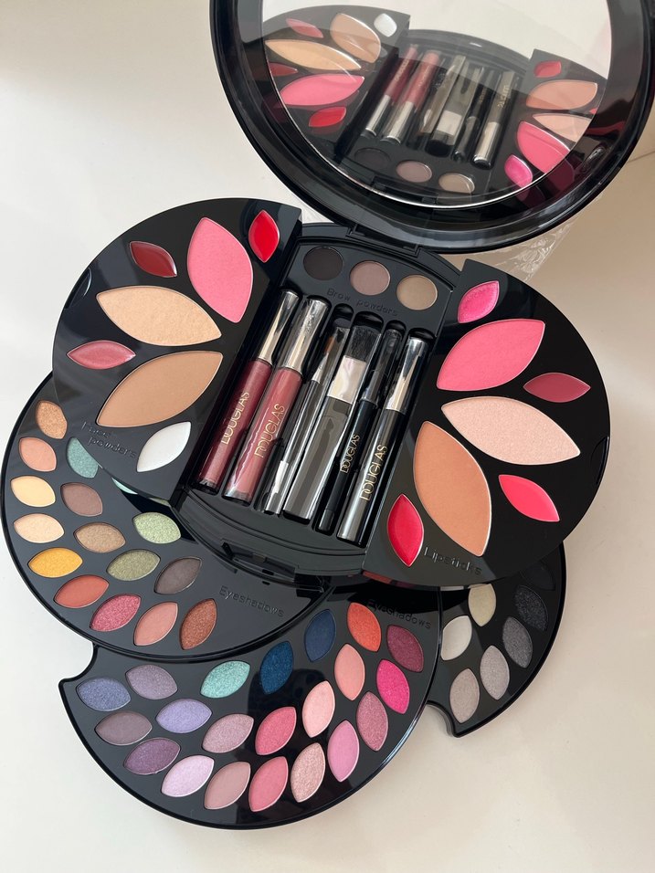 Açık ve koyu tonlarda çok renkli göz farı, kaş farı, göz kalemi, maskara, allık - bronzer, pudra, ruj - dudak parlatıcısı ve uygulama fırçalarını içeren aynalı büyük makyaj paleti.
