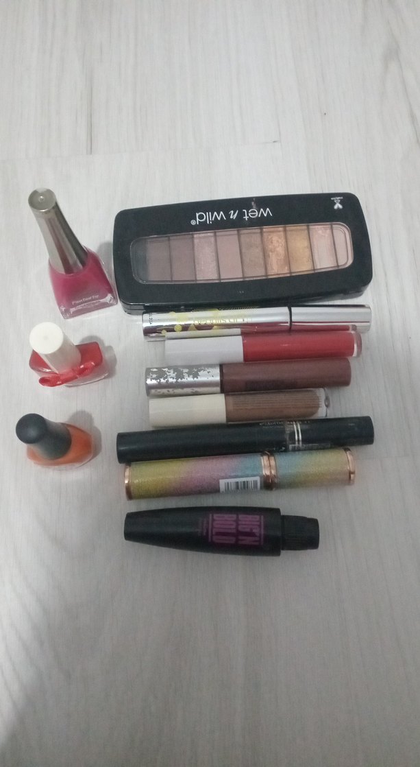Farklı tonlarda far paleti, rujlar, maskaralar ve canlı renklerde oje içeren çok renkli makyaj seti.