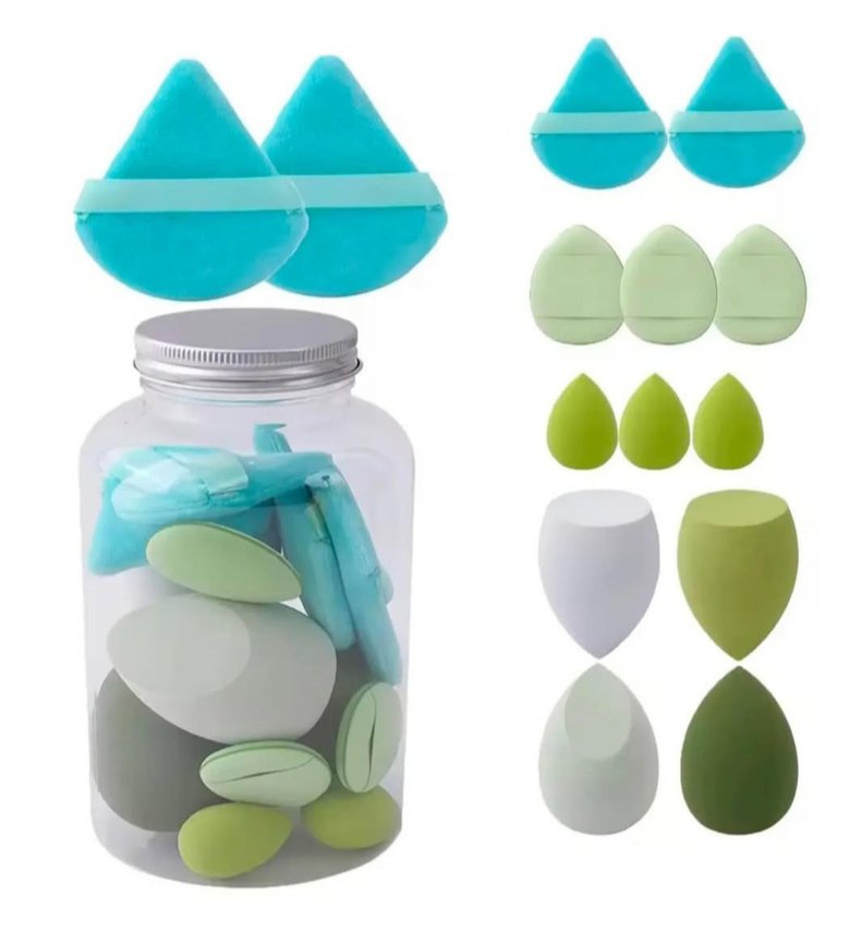 Farklı şekillerde ve açık canlı renklerde çok renkli makyaj süngerleri, şeffaf kavanoz içinde saklanır.