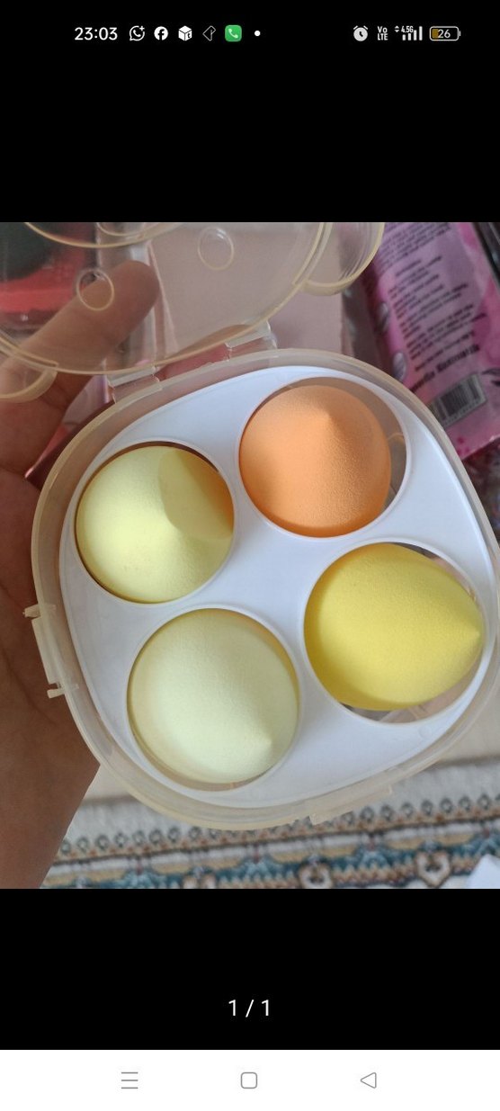 Kompakt kutuda dört adet açık tonlu çok renkli makyaj süngeri seti, pürüzsüz uygulama sağlar.