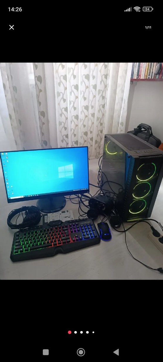 Çok renkli aydınlatmalı kasa, monitör, renkli ışıklı klavye, fare ve kulaklıktan oluşan masaüstü bilgisayar seti.