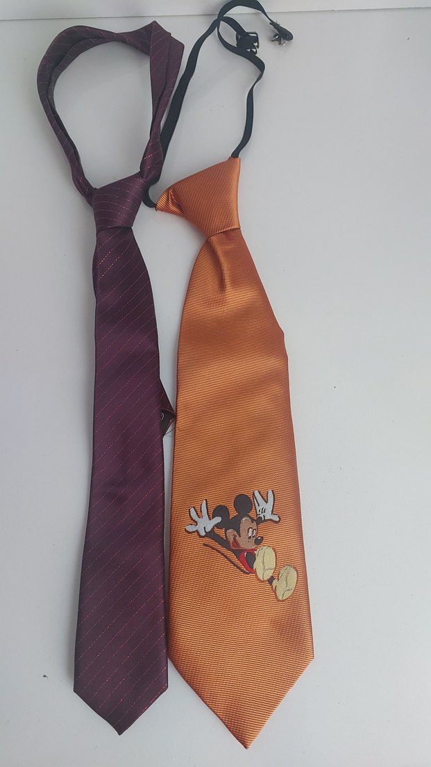 İki adet erkek kravatı; renkli turuncu kravat üzerinde Mickey Mouse deseni ve koyu mor çizgili kravat, iş stiline retro dokunuş katıyor.