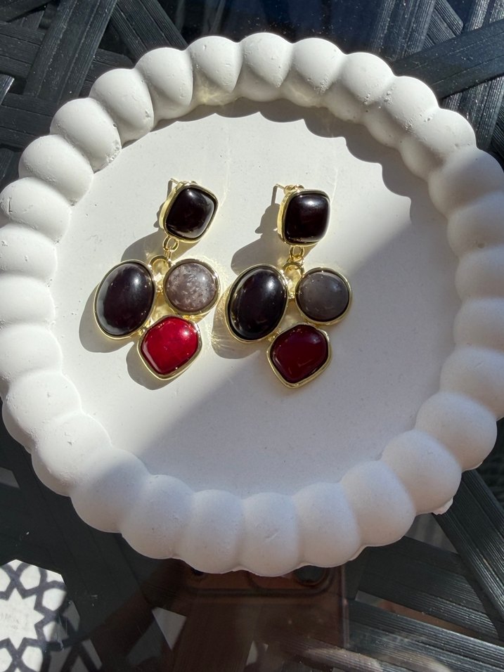 Çok renkli, boncuklu taşlarla desenli, kısa uzunlukta, cesur ve çağdaş kadın küpeleri. Romantik akşamlar için uygun.
