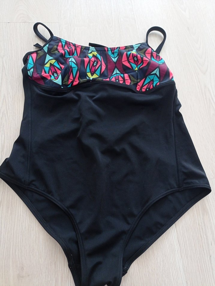 İnce askılı, çok renkli desenli üst kısmı ve koyu renk alt kısmı olan, elastik yapılı, mini boy, modern athleisure tarzda kadın mayosu. ️