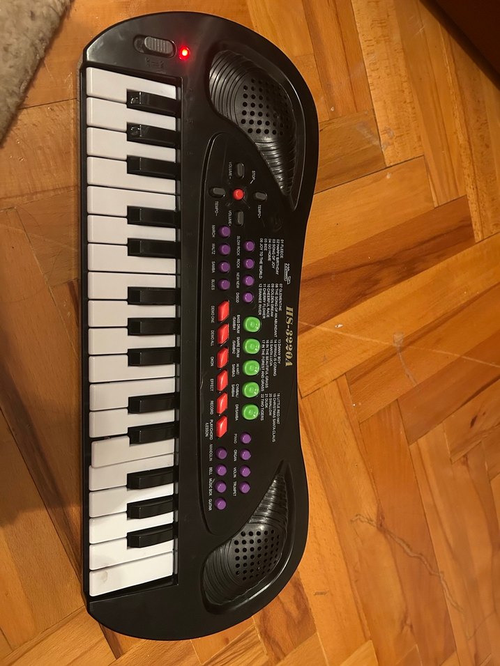 Çok renkli, koyu tonlarda elektronik piyano oyuncak, çeşitli ses ve ritim düğmeleri içerir. Çalışıyor